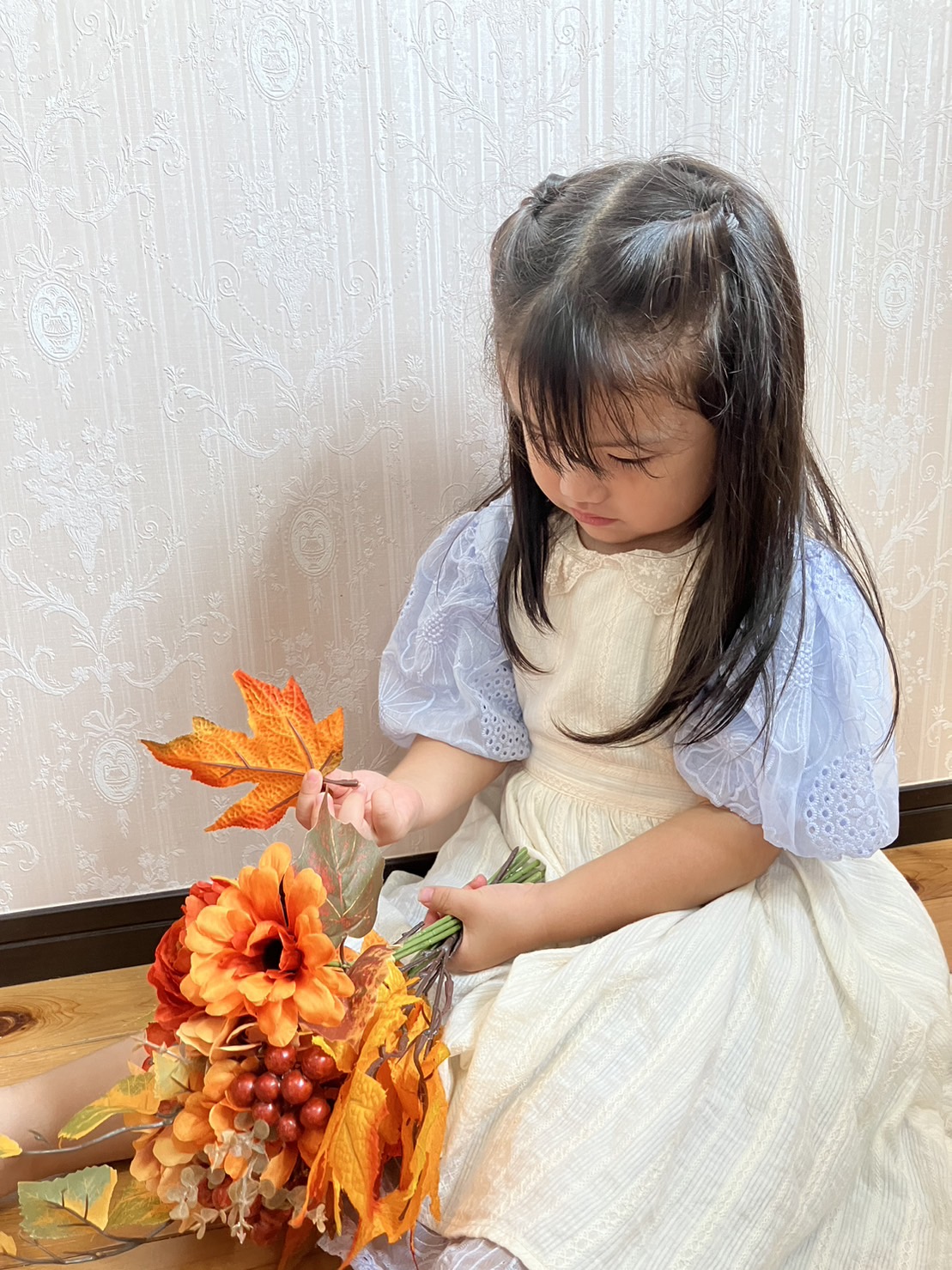 フラワーアレンジメントでは、自然(植物)に触れあい、自由ににお花を組み合わせることで子どもの持つ感性を伸ばします。