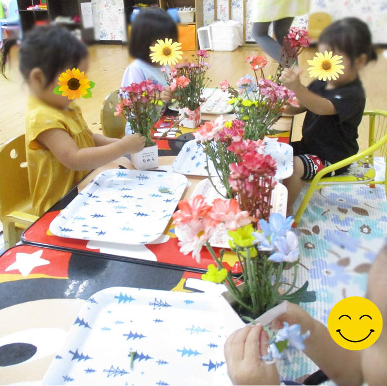 手指をたくさん動かしてフラワーアレンジ(生け花)をすることで、指先の感覚を養います。また、お花への親しみと感性を養い、情緒あふれる豊かな心を育てます。